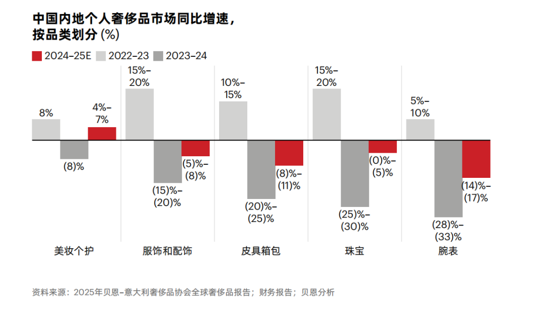 根据国际咨询公司贝恩发布的相关报告,2025年,中国内地个人奢侈品市场萎缩3%–5%,但在三季度呈现复苏迹象。分品类来看,除了美妆个护呈现正增长,服饰配饰、皮具箱包、珠宝、腕表四大品类均呈现负增长。不过,2025年中国内地奢侈品市场整体在恢复,比2024年降幅收窄至3%-5%。