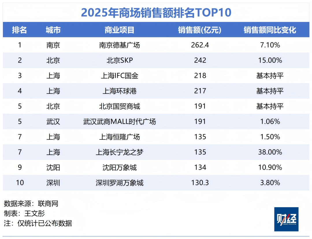 从联商网数据来看,2025年前十大商场中,第三名到第七名的全年销售额比2024年略高或持平,这与奢侈品销售疲软的大环境不无关联。
