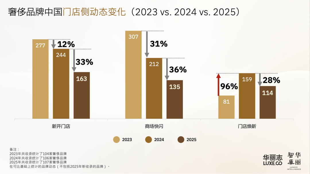 根据奢侈品行业信息服务平台华丽志数据,2025年,奢侈品牌的新开门店总量比2024年下降33%,商场快闪总量下降36%,焕新门店在2024年较高基数上回落28%。
