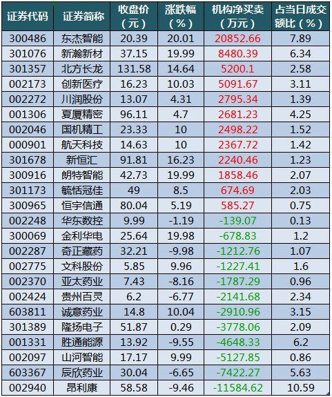 盘后龙虎榜数据显示,今日机构席位资金合计净买入约1.27亿元。其中,净买入的个股12只,净卖出的个股12只。机构净买入最多的股票是东杰智能,净买入金额约2.09亿元;机构净买入居前的还有新瀚新材、北方长龙、创新医疗等股。机构净卖出最多的股票是昂利康,净卖出金额约1.16亿元;机构净卖出居前的还有辰欣药业、山河智能、胜通能源等股。