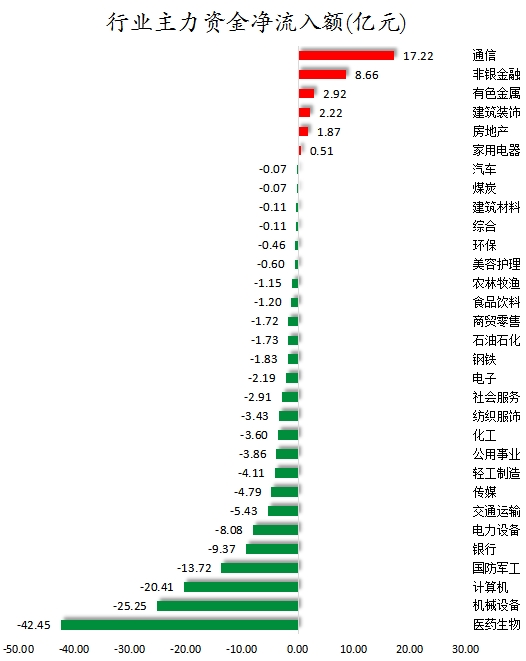 从行业来看,申万所属的31个一级行业,今日有6个行业主力资金呈现净流入,其中,通信行业主力资金净流入最多,净流入金额为17.22亿元;行业主力资金净流入居前的还有非银金融、有色金属等,净流入金额分别为8.66亿元、2.92亿元。25个行业主力资金呈现净流出,其中,医药生物行业主力资金净流出最多,净流出金额为42.45亿元;行业主力资金净流出靠前的还有机械设备、计算机、国防军工、银行、电力设备等,净流出金额分别为25.25亿元、20.41亿元、13.72亿元、9.37亿元、8.08亿元。